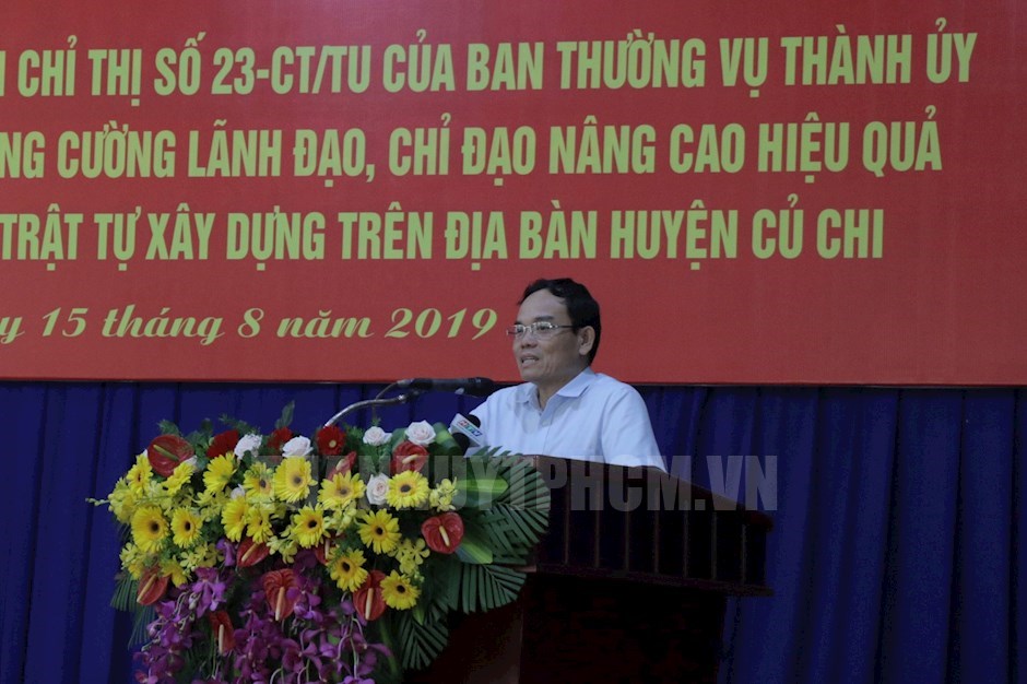 Phát biểu tại hội nghị, Phó Bí thư Thường trực Thành ủy Trần Lưu Quang nhấn mạnh: Chỉ thị 23-CT/TU của Thành ủy có tính cụ thể và kiên quyết hơn so với các Chỉ thị khác, với mốc thời gian rất cụ thể, yêu cầu công việc cụ thể. Vì vậy, huyện Củ Chi cần phải có kế hoạch thực hiện rõ ràng, cụ thể hơn; phải xác định rõ trách nhiệm cá nhân của người đứng đầu; phải có cơ chế phối hợp thật tốt giữa các lực lượng chức năng. Bí thư, trưởng khu phố, ấp, cảnh sát khu vực, công an viên, đoàn thể… phải phát huy vai trò kiểm tra, giám sát để phát hiện nhanh và báo cáo kịp thời các trường hợp sử dụng đất sai mục đích, xây dựng không phép, sai phép… để có biện pháp xử lý kịp thời. Đặc biệt là phải làm tốt công tác tuyên truyền, truyền thông để nhân dân biết và ủng hộ cấp ủy, chính quyền làm tốt công tác quản lý Nhà nước về xây dựng. Cấp ủy, chính quyền cũng phải thường xuyên kiểm tra, giám sát để điều chỉnh chủ trương, biện pháp cho phù hợp với tình hình thực tế, đồng thời chấn chỉnh hành vi vi phạm của cán bộ nếu có.
